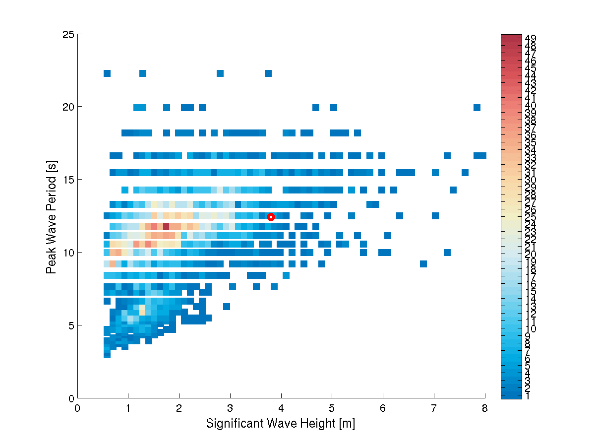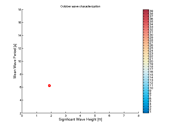 Wave height, character with respect to normal conditionsWaves are more related to what is known as marine meteorology than oceanography. They are a direct conse- quence of the wind blowing on the ocean surface and the sea-state strongly conditions human activities at sea, from navigation to fishing and recreational. Actually the main purpose of the existing oceanic buoy network in Spain is the measurement of the wave field. Wave field is characterized by the height of the waves, the period and the direction of propagation. The common measure of wave height (the most evident characteristic) is the significant wave height defined as the average of the third tallest waves. Figure provides the realtime wave significant height and period over a 2D chart of the monthly climatology. |